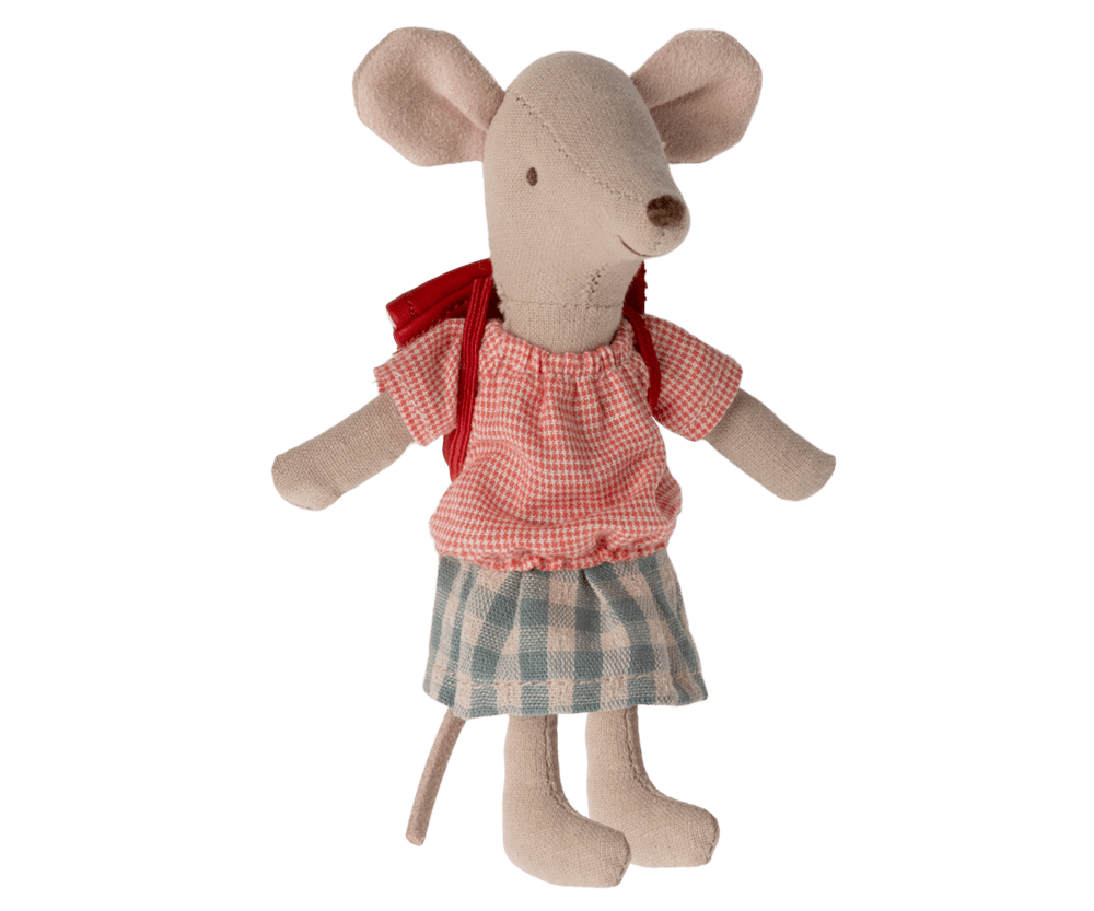 Esta ratona, hermana mayor está lista para ir al colegio con su mochila en la espalada.