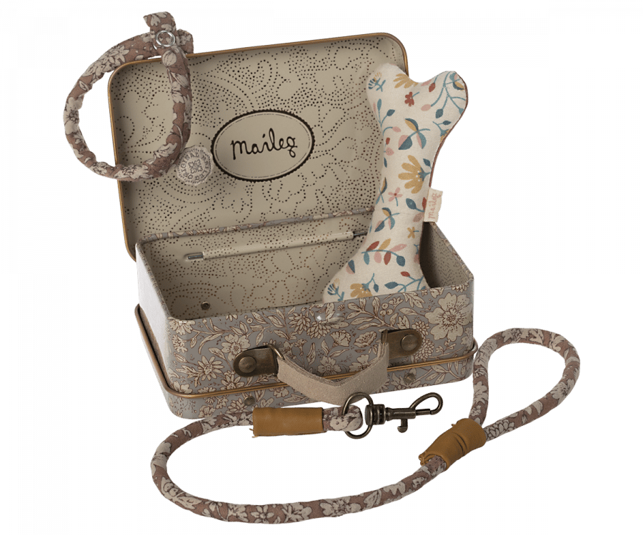 Este juego es todo lo que necesitas para tu perro peluche. Incluye un hueso, collar y correa perfectamente embalados en una maleta de metal con un bonito estampado de Maileg.